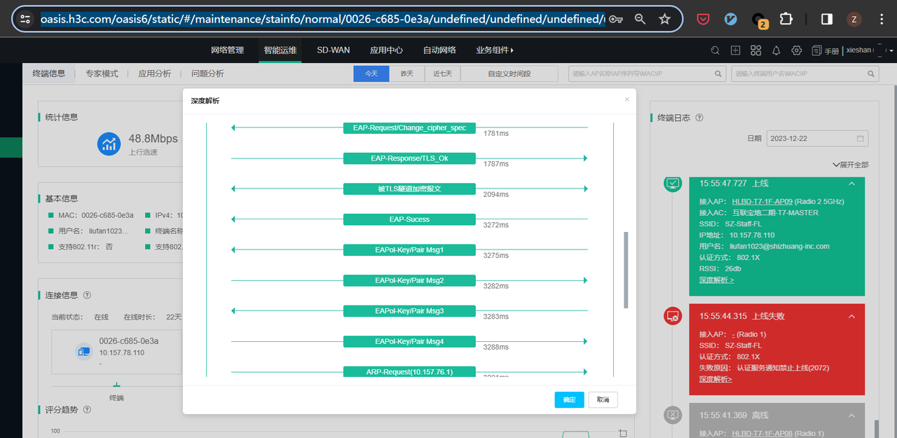 1、想请问无线控制器、以及云简平台上可以查看 802.1x认证过程中报文交互的颗粒度最细能达到什么程度,需要如何查看?比如云简上开启了【深度检测】我们可以看到如下交互,是否还有更加详细的?控制器上如何查看?