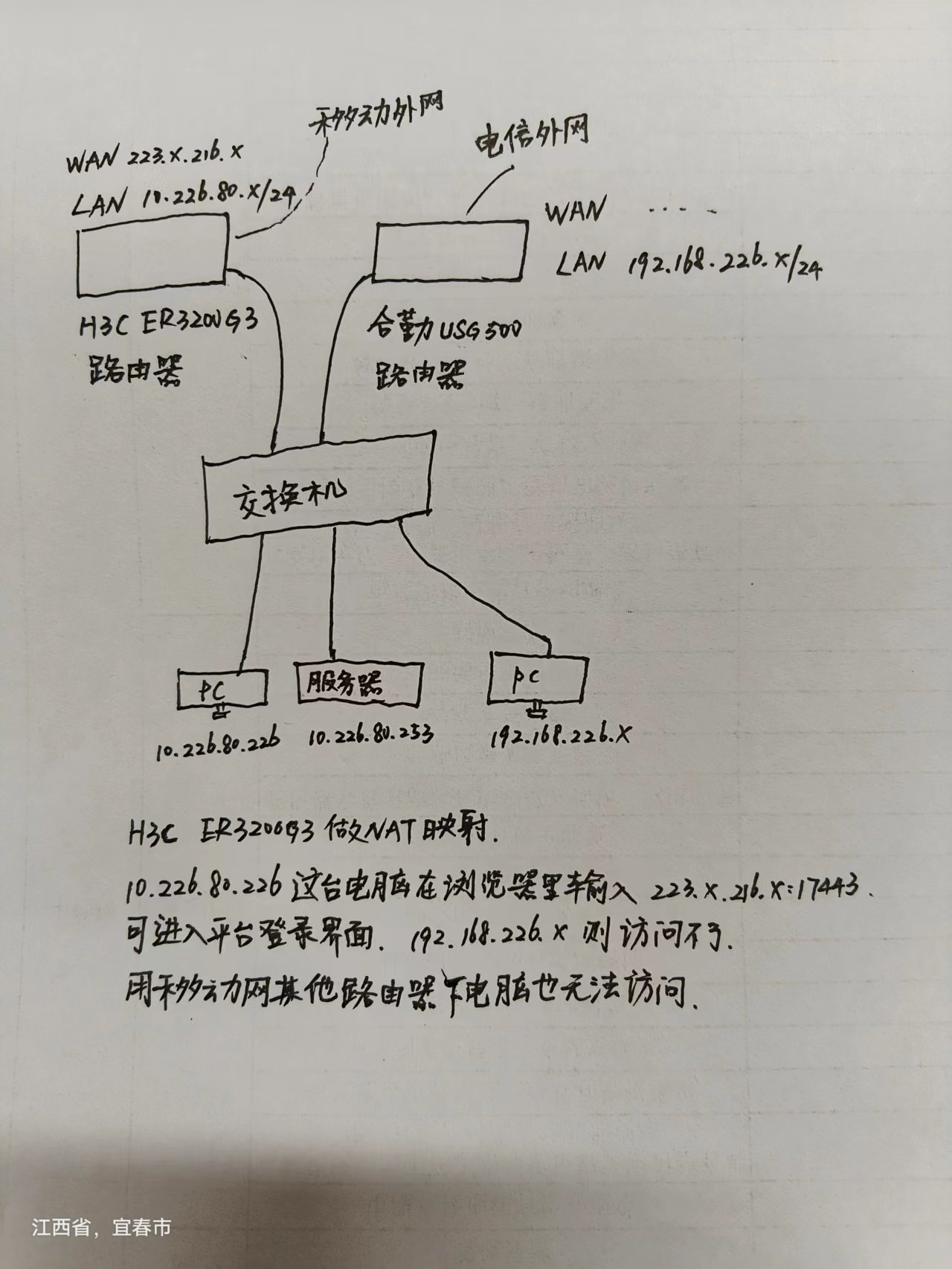 不是上网,192那个电脑可以上网,走USG500.是要用192那个电脑访问10.226.80.253那台服务器,192的电脑ping 223.X.216.X可以ping通,绕了一大圈,就是被H3C路由器拦着不让访问 10.226.80.253这个服务器。但是10.226.80.226那个电脑上做了个简易的HFS文件服务器,居然可以访问到