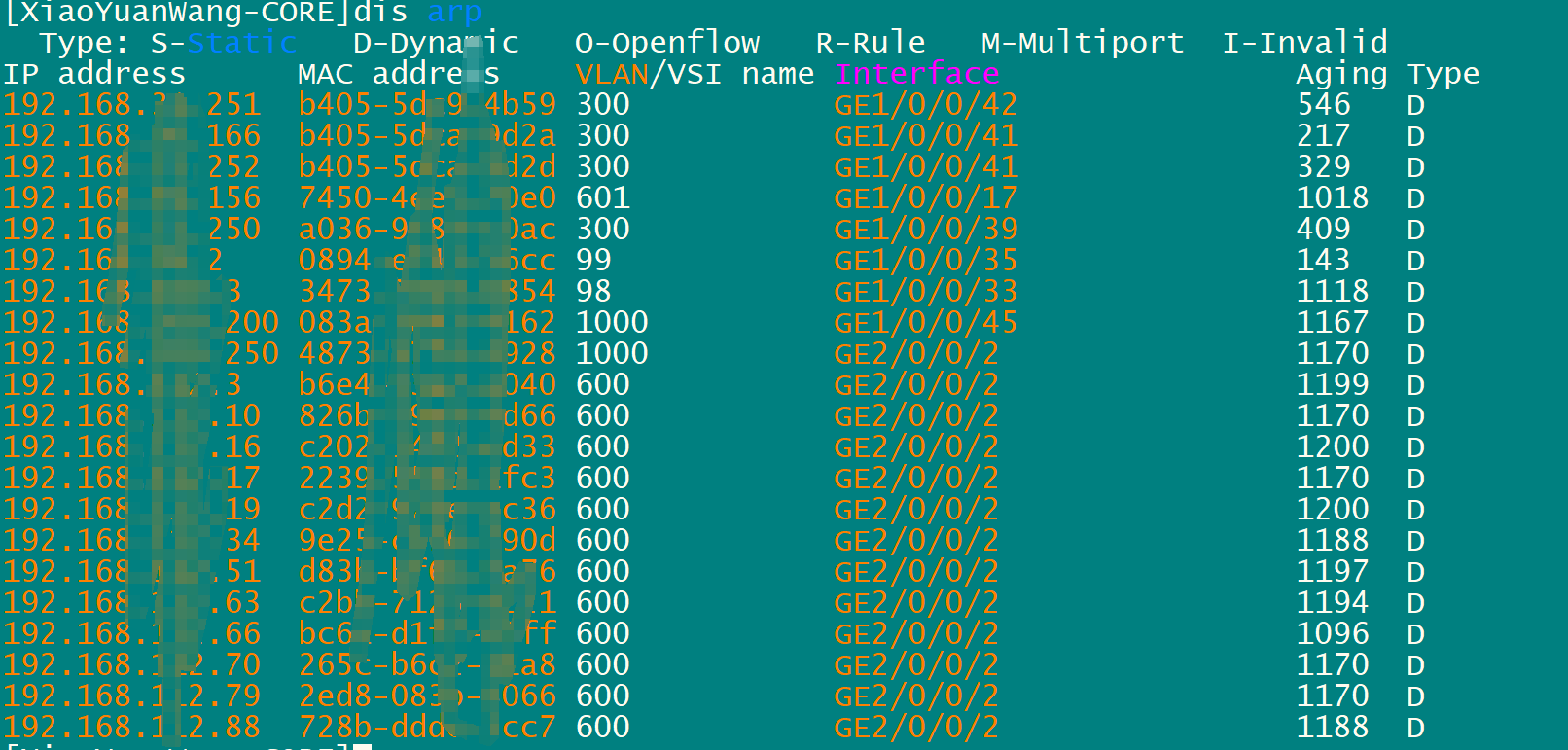 在核心上 dis arp 查看 (业务地址网关所在交换机使用这条命令)