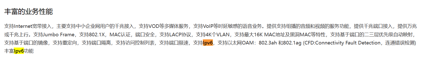 这款交换机支持了IPV6基础功能和丰富的IPV6特性。