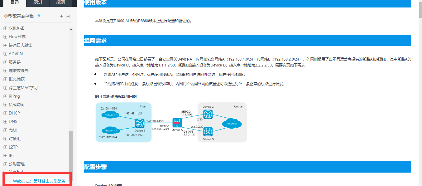 防火墙上网配置请参考“2.2.2 防火墙外网使用固定IP地址上网配置方法”进行配置,本文只针对策略路由配置进行介绍。