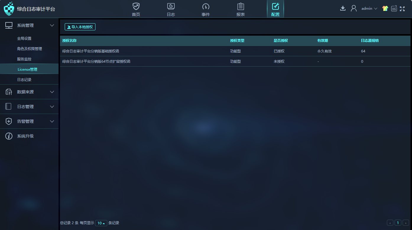 3130A3CS | 综合日志审计平台-基础平台组件授权函 | · 控制系统登录,只有导入此授权函才能登录并使用系统,默认包含1024个节点的授权 · 仅适用于综合日志审计(CSAP-SA) |