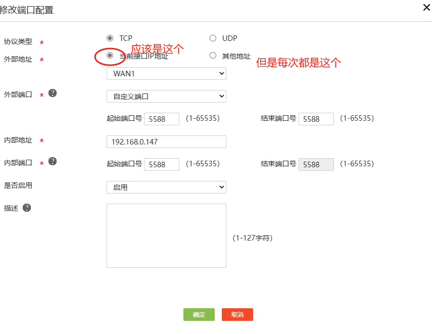 我的设备是拨号上网,每次ip地址变动,端口映射的外网地址,总是其他地址,就是原来的ip地址,不是当前的ip地址,只能手工修改nat配置中的端口映射。把其他地址,修改成当前ip地址。很麻烦。