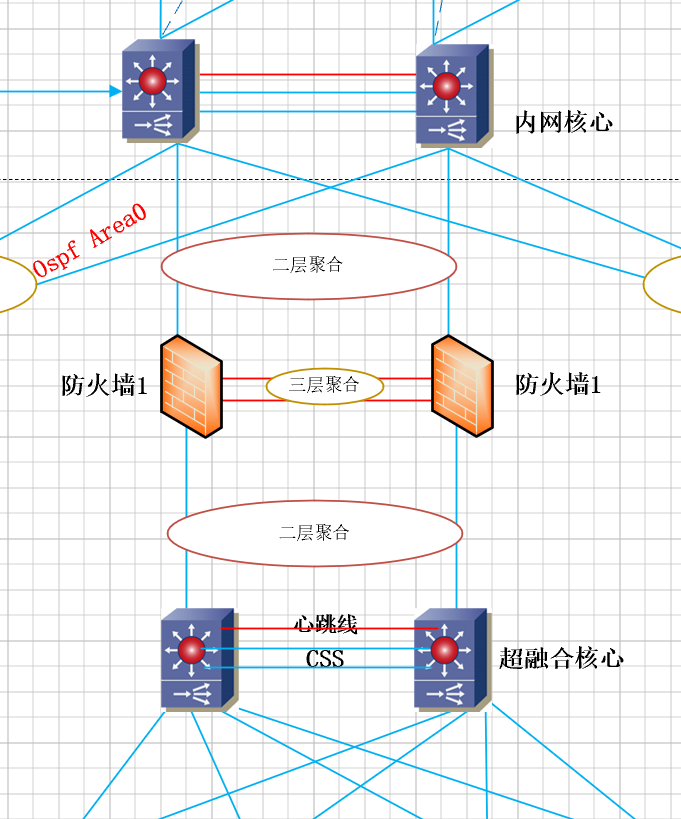 两台防火墙做二层透明部署,上下级联两个核心区域交换机,上下两台核心各自堆叠,中间的链路能否按此图上实现聚合组网?如果无法实现,此处应该怎么去部署