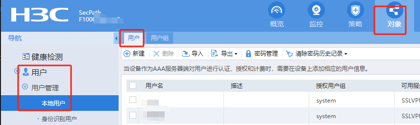 # 选择“对象 > 用户 > 用户管理 > 本地用户”,进入用户界面,参数配置如下图所示。
