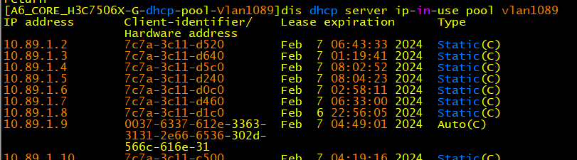 如图,我在7506上做了个AP管理地址段的全局DHCP地址池,正常其它AP地址都做了DHCP地址池内静态分配绑定,但有一个AP没有绑定,如图10.89.1.9实际对应MAC地址7c7a-3c11-fe60,想确认下,Client-identifier/Hardware address字段中10.89.1.9的字符为什么不是终端设备实际的MAC地址,现在该字段的字符串是什么意思