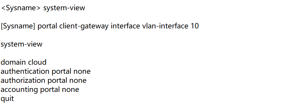 [Sysname] portal client-gateway interface vlan-interface 10