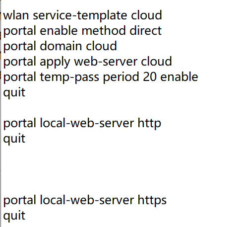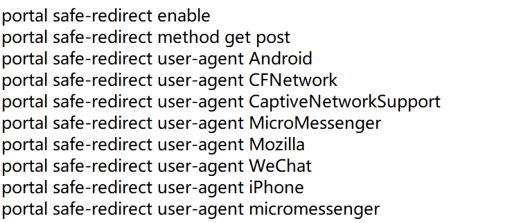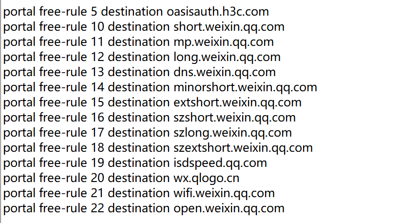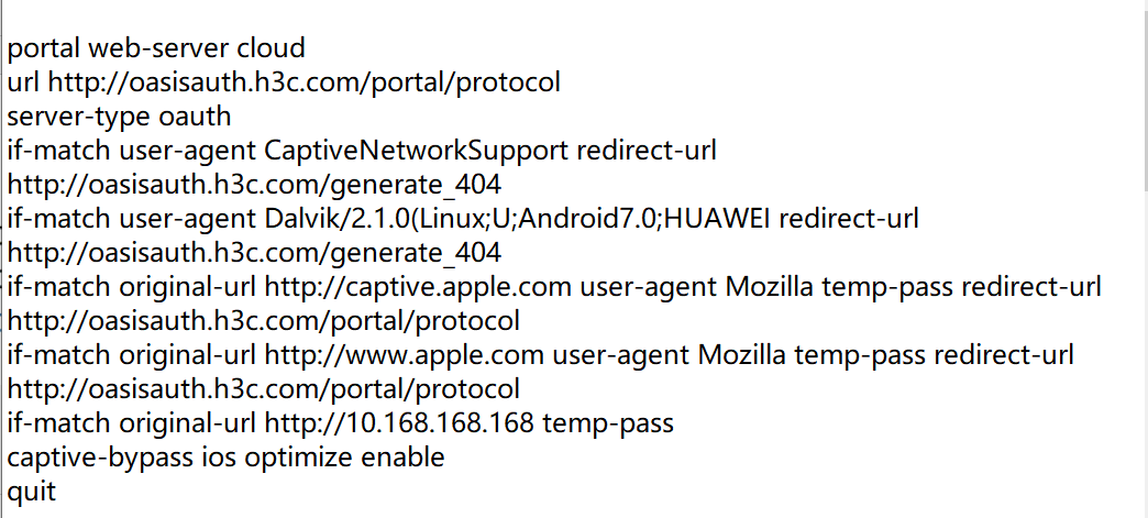 当数据报文转发位置配置在AP上,且用户进行Portal第三方认证时,client和AP通过公网直接与第三方认证服务器进行报文交互,不会经过AC。但是第三方认证服务器在返回报文时会要求client访问AC,而client是不知道AC的IP地址的,因此需要通过配置AC的接口来让客户端获得AC的IP地址,以便客户端访问AC。 在全局模式下配置Portal认证时客户端访问AC的接口为vlan-interface 10(AC上三层接口) <Sysname> system-view [Sysname] portal client-gateway interface vlan-interface 10 system-view domain cloud authentication portal none authorization portal none accounting portal none quit portal web-server cloud url http://oasisauth.h3c.com/portal/protocol server-type oauth if-match user-agent CaptiveNetworkSupport redirect-url http://oasisauth.h3c.com/generate_404 if-match user-agent Dalvik/2.1.0(Linux;U;Android7.0;HUAWEI redirect-url http://oasisauth.h3c.com/generate_404 if-match original-url http://captive.apple.com user-agent Mozilla temp-pass redirect-url http://oasisauth.h3c.com/portal/protocol if-match original-url http://www.apple.com user-agent Mozilla temp-pass redirect-url http://oasisauth.h3c.com/portal/protocol if-match original-url http://10.168.168.168 temp-pass captive-bypass ios optimize enable quit wlan service-template cloud portal enable method direct portal domain cloud portal apply web-server cloud portal temp-pass period 20 enable quit portal local-web-server http quit portal local-web-server https quit ip http enable ip https enable portal host-check enable portal user log enable portal free-rule 1 destination ip 114.114.114.114 255.255.255.255 portal free-rule 2 destination ip any udp 53 portal free-rule 3 destination ip any tcp 53 portal free-rule 4 destination ip any tcp 5223 portal free-rule 5 destination oasisauth.h3c.com portal free-rule 10 destination short.weixin.qq.com portal free-rule 11 destination mp.weixin.qq.com portal free-rule 12 destination long.weixin.qq.com portal free-rule 13 destination dns.weixin.qq.com portal free-rule 14 destination minorshort.weixin.qq.com portal free-rule 15 destination extshort.weixin.qq.com portal free-rule 16 destination szshort.weixin.qq.com portal free-rule 17 destination szlong.weixin.qq.com portal free-rule 18 destination szextshort.weixin.qq.com portal free-rule 19 destination isdspeed.qq.com portal free-rule 20 destination ***.*** portal free-rule 21 destination wifi.weixin.qq.com portal free-rule 22 destination open.weixin.qq.com portal safe-redirect enable portal safe-redirect method get post portal safe-redirect user-agent Android portal safe-redirect user-agent CFNetwork portal safe-redirect user-agent CaptiveNetworkSupport portal safe-redirect user-agent MicroMessenger portal safe-redirect user-agent Mozilla portal safe-redirect user-agent WeChat portal safe-redirect user-agent iPhone portal safe-redirect user-agent micromessenger