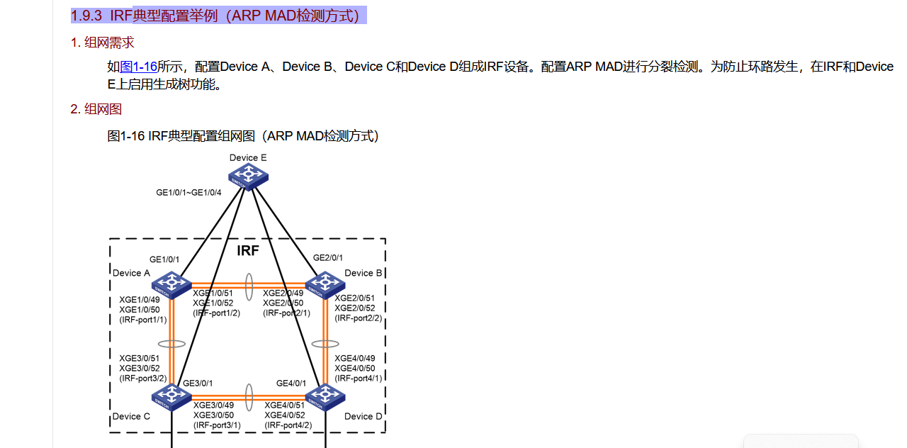 如图1-15所示,配置Device A、Device B、Device C和Device D组成IRF设备。配置BFD MAD进行分裂检测。