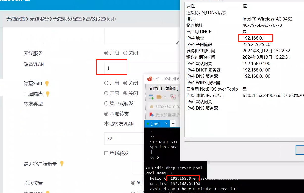 您好,客户端获取的vlan地址是无线服务模板绑定的vlan对应的地址池