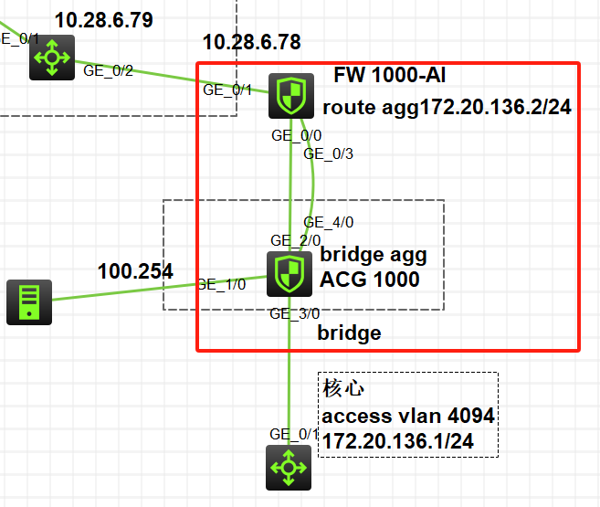 如图:防火墙和核心对接,中间ACG做为透传,防火墙和ACG两条线做静态聚合。防火墙测做三层静态聚合,地址172.20.136.2,ACG测做二层静态聚合,ACG下行口二层口。透传到下面的核心交换机。