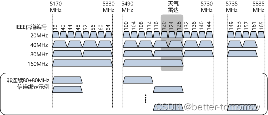同样的,只有36、40、44、48可以组合成一个 80MHz 的捆绑信道, 40、48 、52、56却不能进行捆绑。
