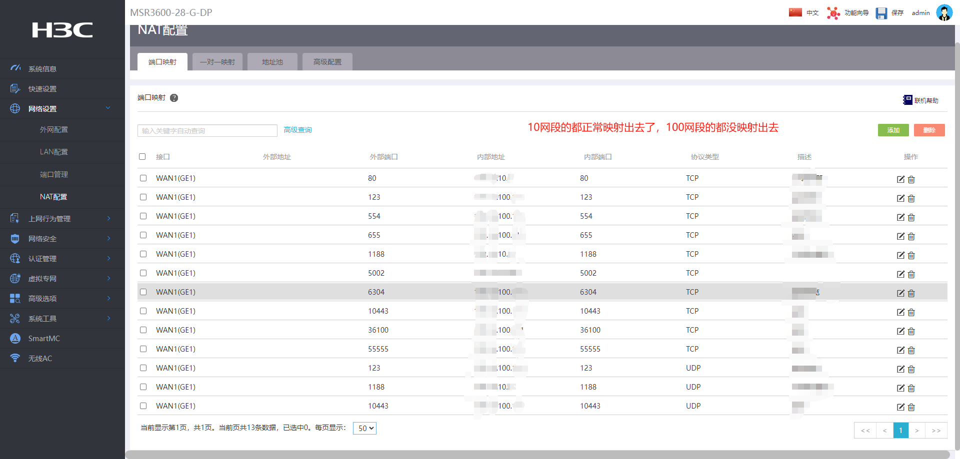 配置了两个VLAN,lan接口使用的是二层交换模式,WAN配置了静态地址,有外网固定IP一个,VLAN1网段192.168.10.1,VLAN2网段是192.168.100.1,已将VLAN1的192.168.10.10:80服务器映射到外网(使用正常),现在需要将VLAN2的192.168.100.2:8000的服务器映射到外网,配置了端口映射,但是外网无法访问192.168.100.2:8000的内网服务器,请指导下该如何配置才能将VLAN2的192.168.100.2:8000的内网服务器正常映射的外网,,VLAN划分如图,也尝试全选1-2但是依然不能映射100网段到外网,使用WEB人机界面,不要敲命令的配置方式。