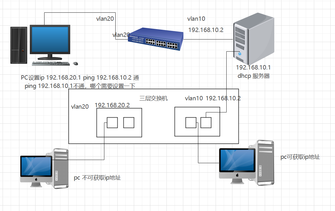 服务器位于vlan10 vlan20的机器要获得dhcp 分配的ip ,则需要交换机做dhcp中继,获取不到。为了排除原因,我