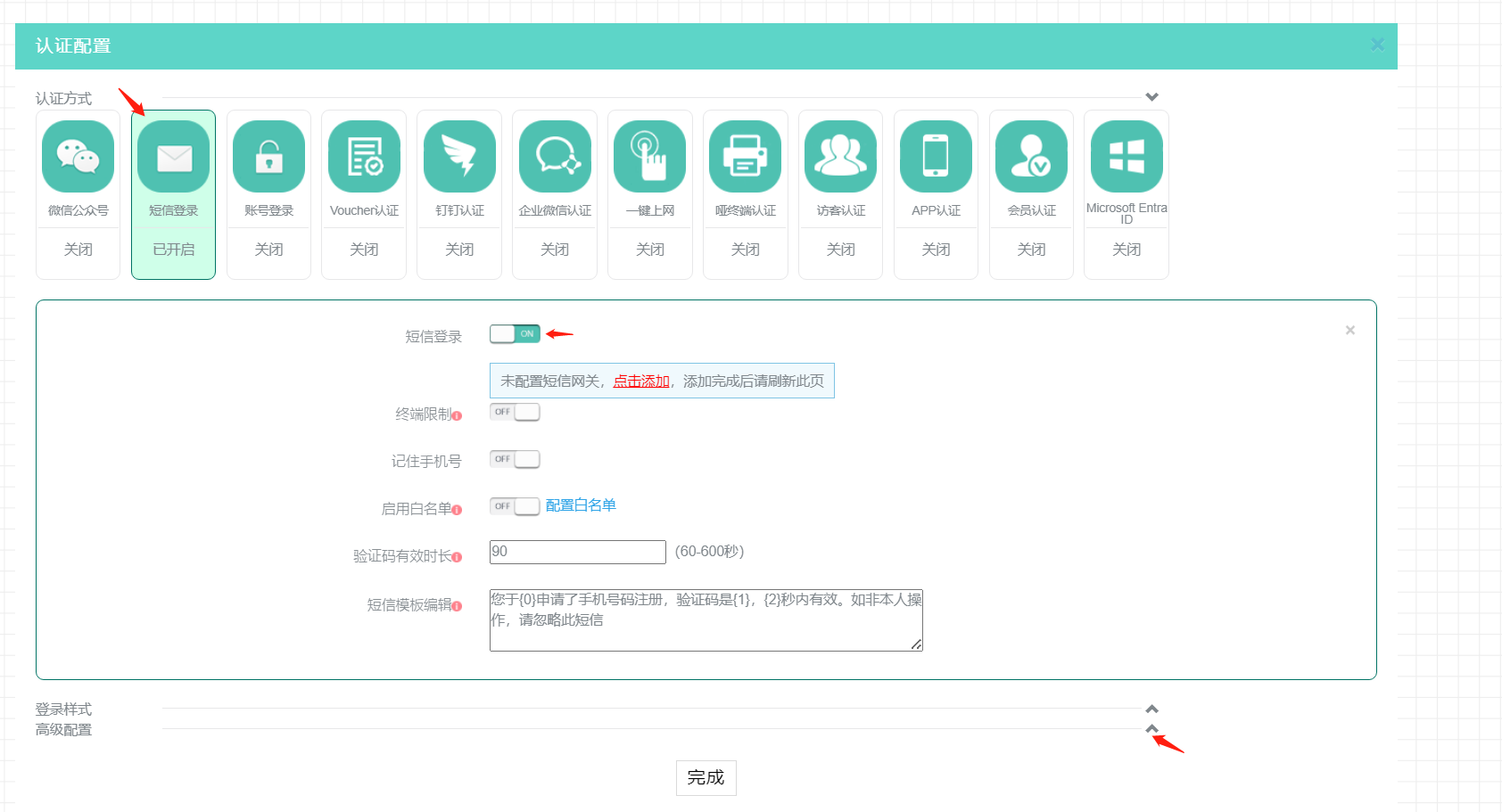(2) 点击“登录 > 认证”进入认证绘制页修改认证配置,点开认证方式伸缩栏,然后开启“短信登录”功能。