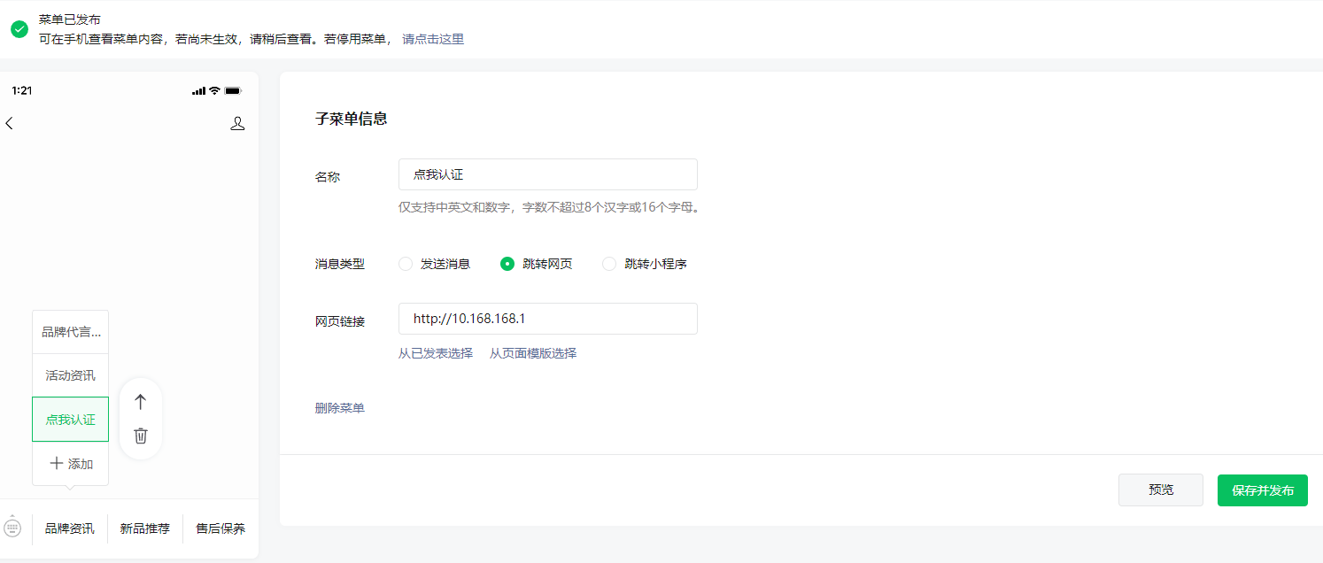 按照文档,微信公众号里自定义菜单“点我认证”,填写的地址是http://10.168.168.1,这里是不是不应该填写这个地址啊?