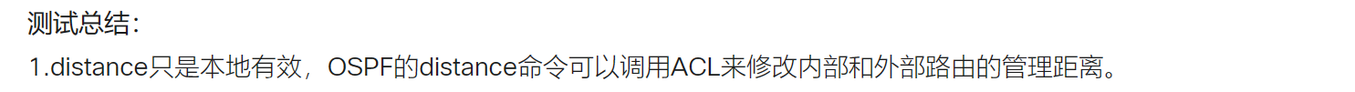 distance命令用于配置OSPF路由的管理距离。 no distance命令用于恢复缺省情况。 缺省情况下,OSPF外部路由管理距离为150,区域内路由、区域间路由管理距离为110。 通过distance命令配置OSPF路由管理距离,带参数ospf时,即根据OSPF路由类型配置不同的管理距离;带参数ip-address时,即配置指定IP网段OSPF路由的管理距离;不带参数时,即配置所有OSPF路由管理距离。当同时配置distance,distance ospf和distance ip-address时,distance ip-address优先级最高,distance ospf优先级次之,distance优先级最低。