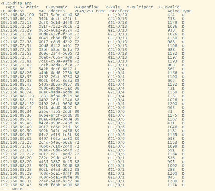也就是展示出arp解析表,每个ip对应的mac地址及交换机的物理端口