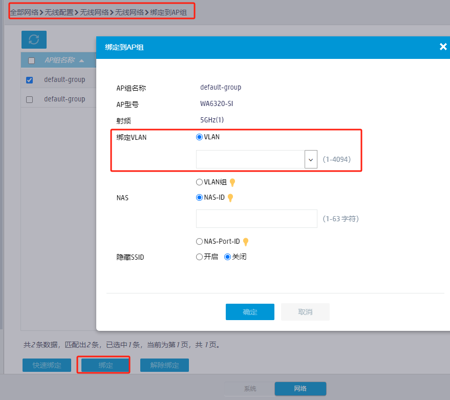 你的这个界面应该在AP管理-修改AP配置,但是这个地方没显示绑定了VLAN10