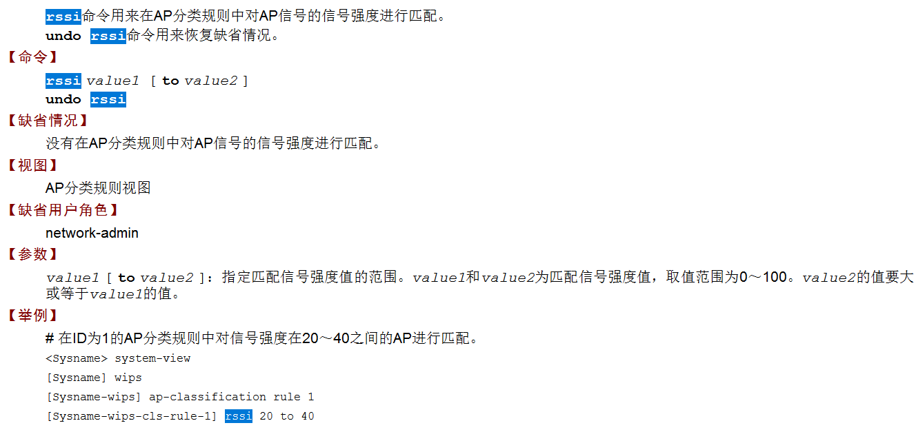 rssi rssi-value:无线客户端信号强度门限值,取值范围为5~100,单位为dBm,缺省值为20。