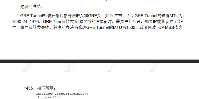 我这边公网做了GRE VPN,发现可以ping通对端业务但是访问http页面卡顿不出来,我查看官网说是改大接口的mtu,不是应该是改小然后进行分片吗。求大佬解释解释,官网资料如下