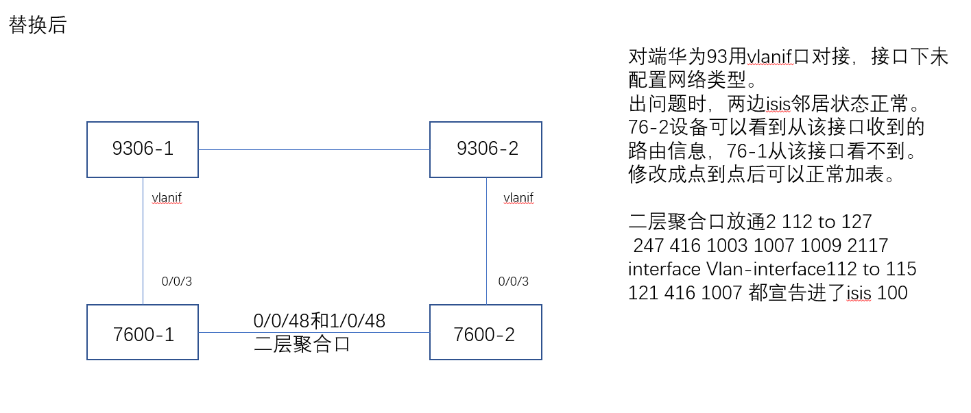 当晚的问题为上联93-2能和76-2建立isis的ipv4邻接关系并加表,但是76-1能和上行的93-1建立邻接关系,加不了路由表。后来在76-1和93-1上修改了网络类型为点到点以后正常。