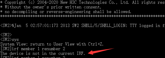 根据您的描述,您在执行 irf member 1 renumber 2 命令时遇到了 “The device is not in the current IRF” 的提示。这意味着当前设备不处于 IRF(虚拟路由冗余)模式下。