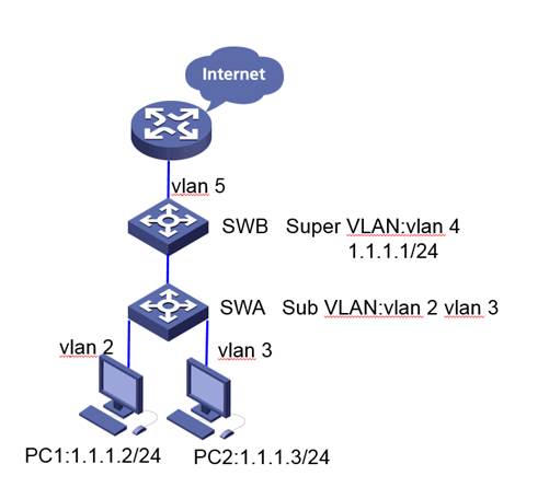 [SWB-vlan4]subvlan 2 to 3 //建立supervlan4和sub vlan2、3的映射关系