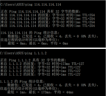 #PC1配置1.1.1.2/24接SWA的G1/0/2口,PC2配置1.1.1.3/24接SWA的G1/0/3口。此时两个终端都可以访问114.114.114.114,也可以互访。下面是PC2上的测试结果。