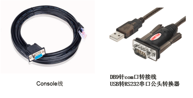 l Console线:一端是RJ-45水晶头(网口),一端是DB9的串口(9针头)。台式机通常自带COM口,连接线缆的DB9串口,如果是笔记本,则可以使用DB9针-USB口转接线缆,连接方法见1.2节。部分产品发货自带Console线,若发货未带,需和DB9针-USB口转接线缆一样由用户去电脑城或网上购买备用。