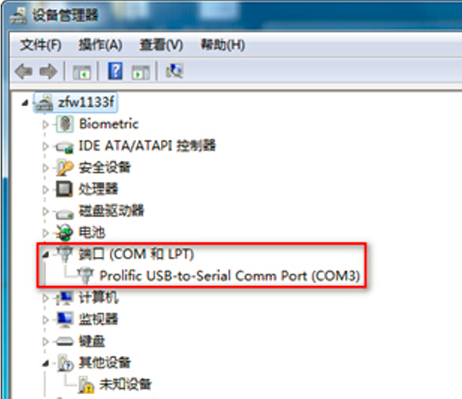 # 右击【计算机】选择【属性】--【设备管理器】--【端口】,查看确认电脑上使用的通信端口,本案例中使用COM3。
