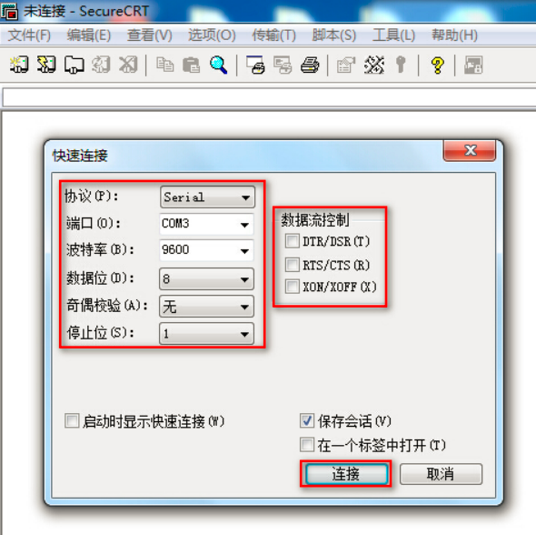 # 双击运行SecureCRT软件,找到【文件】菜单下【快速连接】选项,如下图,协议选Serial,端口选com3,波特率为9600,数据位为8,奇偶校验无,停止位为1,最后点击【连接】。