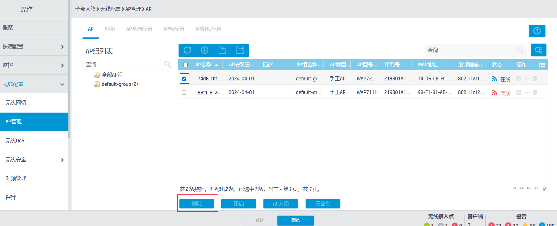 要删除自动上线的AP,需要先关闭自动上线功能,然后再删除AP。