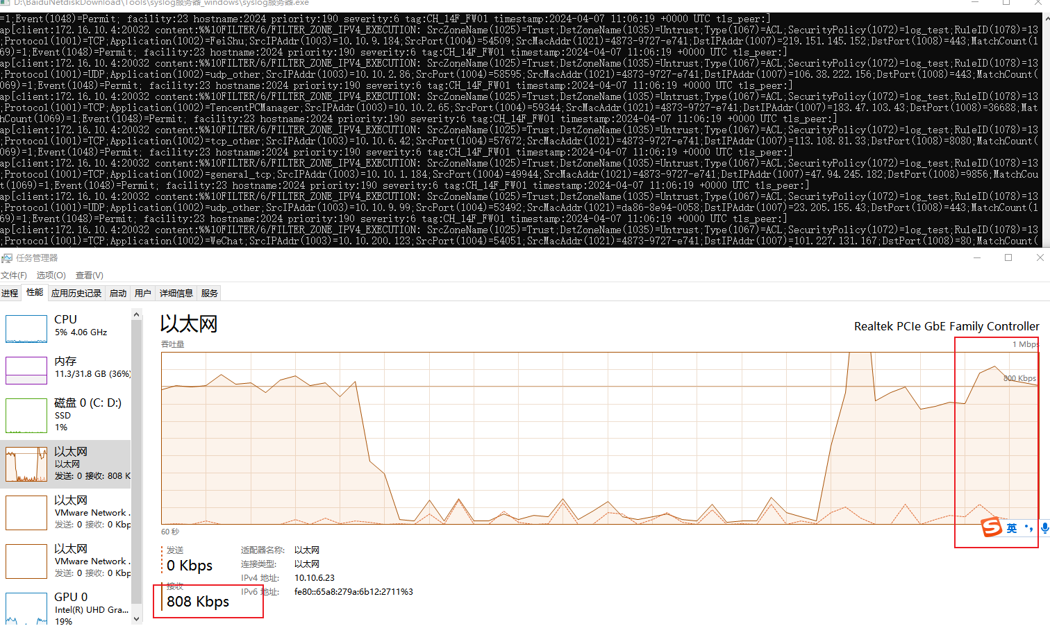 观察到日志服务器在接下来的2分钟内还有收到数据,大致可以判断是防火墙的日志瞬时发送瓶颈导致的