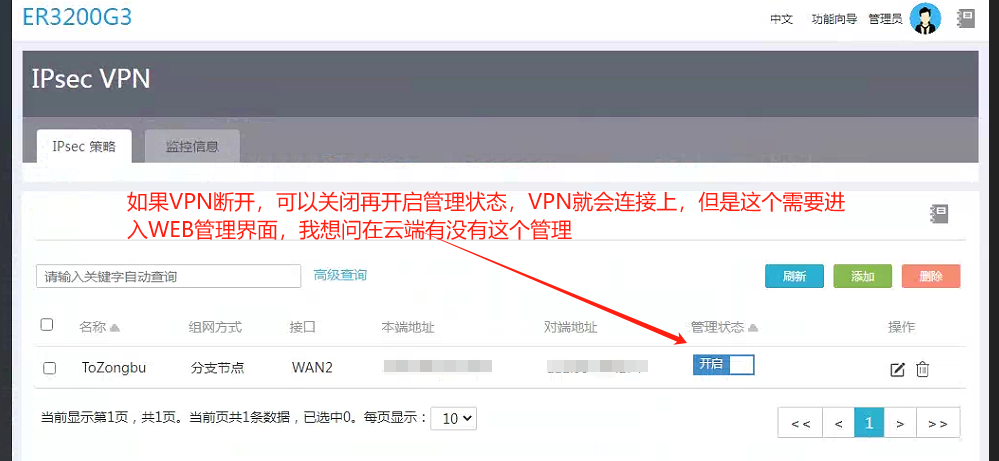 ER3200G3是在我们的一个分店当VPN设备,因为我发现有时候IPSEC VPN拨号会掉线,人工通过局域网的WEB页面进入后,通过关闭开启VPN状态,可以使VPN重新连接上,但是不一定人在设备旁边,所以我想试试手机使用cloudnet app远程控制ER3200G3进行VPN连接,大家可看附图