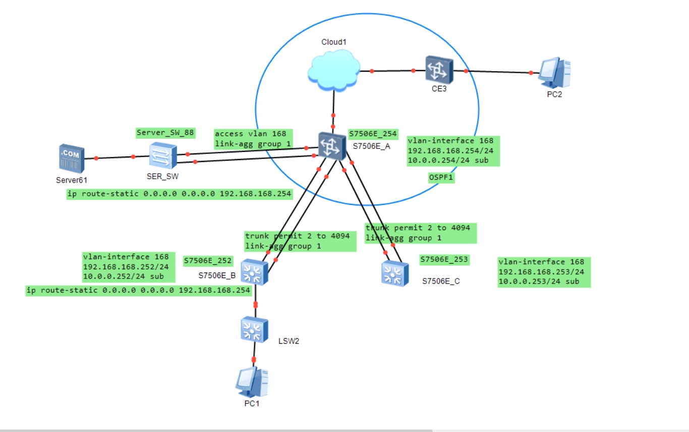 服务器在接入交换机上,接入交换机二层汇聚到核心,核心上还有两组聚合到汇聚设备。