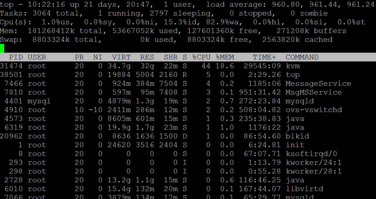 重启该节点后可以恢复所有虚拟机显示 但是没过多久又会出现这个问题  ssh进CVM后台后看到进程信息如下 只有一台kvm(和其他几台CVK不太一样)