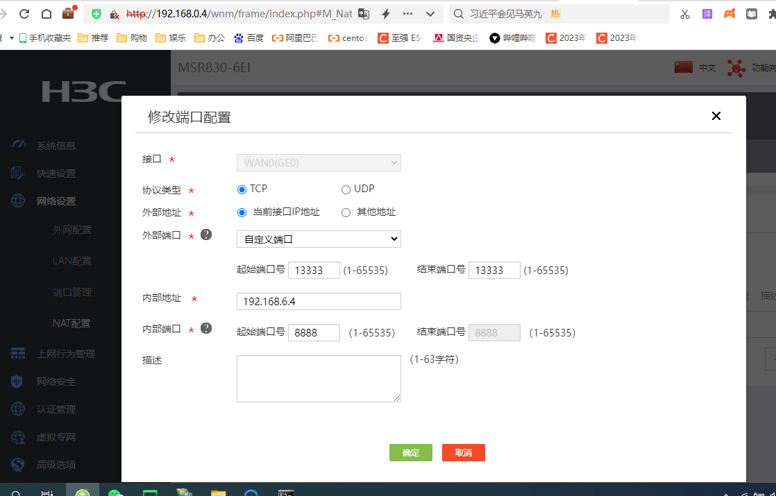 设备是H3C MSR830-6EI ,内网可以访问8888端口,但是在GE0上做映射后无法访问13333端口,如何解决。