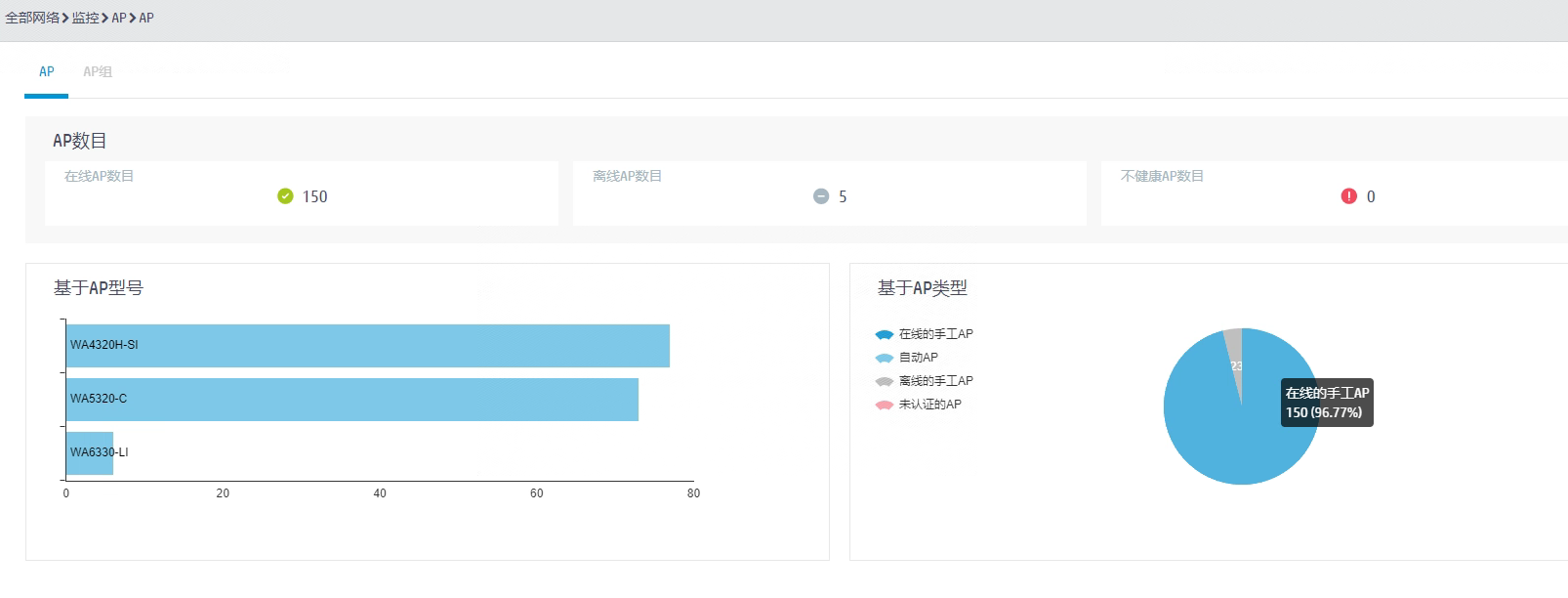 看到AP数量:WA4320H-SI有76个;WA5320-C有73个;WA6330-LI有6个;其中显示在线AP数目150个,离线AP数目5个。