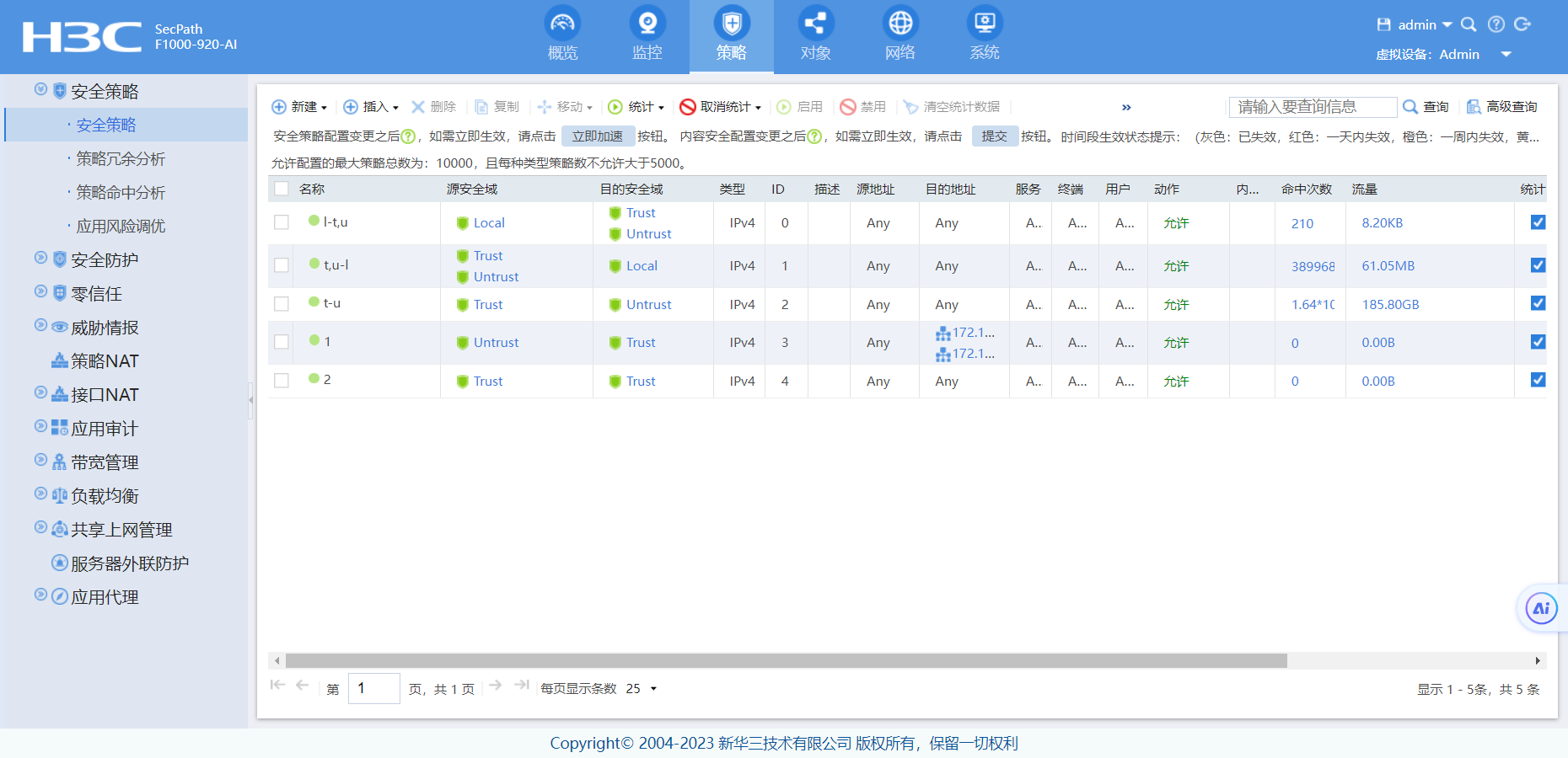 防火墙测试只有5个人使用6小时,策略trunk到untrunk流量有180G,但是untrunk到trunk只有600mb.这个流量异常吗,下面是配置,只有1口4口在使用