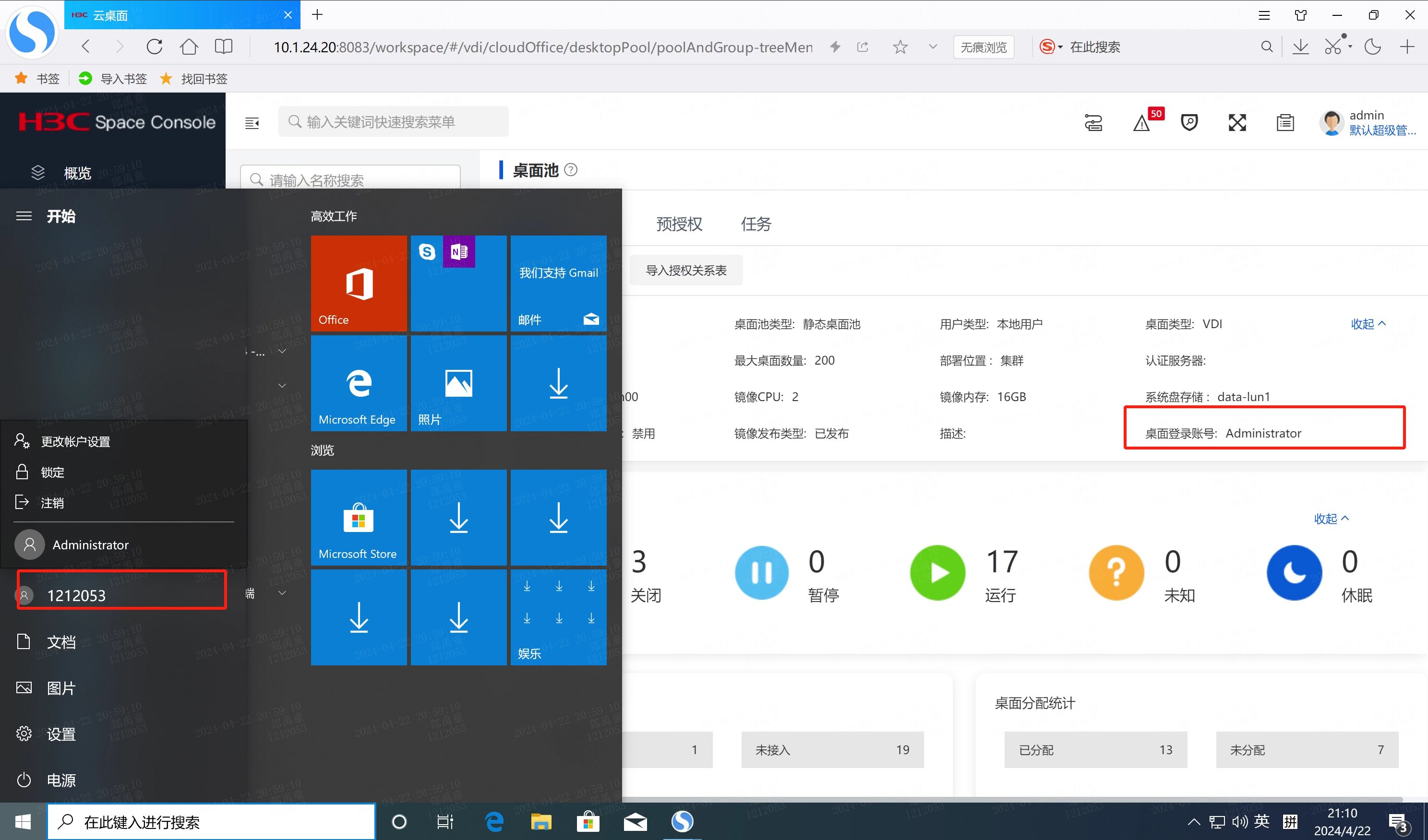 云桌面E1016P02场景,设定桌面池登录账号为Administrator,客户端连接桌面登录账户为用户账户