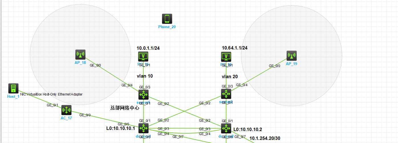 interface Vlan-interface10 ip address 10.0.1.10 255.255.255.0 # interface Vlan-interface20 ip address 10.64.1.10 255.255.255.0 # interface Vlan-interface56 ip address 192.168.56.2 255.255.255.0 wlan ap 8ed2-7916-1200 model WA6320-HCL serial-id H3C_8E-D2-79-16-12-00 vlan 1 radio 1 radio enable service-template 1 vlan 10 radio 2 gigabitethernet 1 # wlan ap 8ed2-7c7b-1300 model WA6320-HCL serial-id H3C_8E-D2-7C-7B-13-00 vlan 1 radio 1 radio enable service-template 2 vlan 20 radio 2 gigabitethernet 1 这是AC的你看一下哥