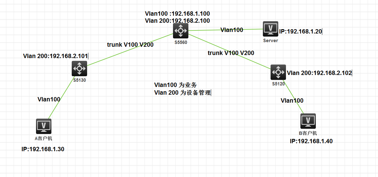 5560作为网络中的核心交换机,Vlan 200 为设备管理。vlan 100 地址为:192.168.1.100 做为下面客户机的网关,A客户机能ping 通网关,B客户机时不是的要ping不通网关,但,A客户机与B客户机能相互Ping通。也能ping通server 192.168.1.20 。请各位大老帮我看一下,这是那里出了问题。