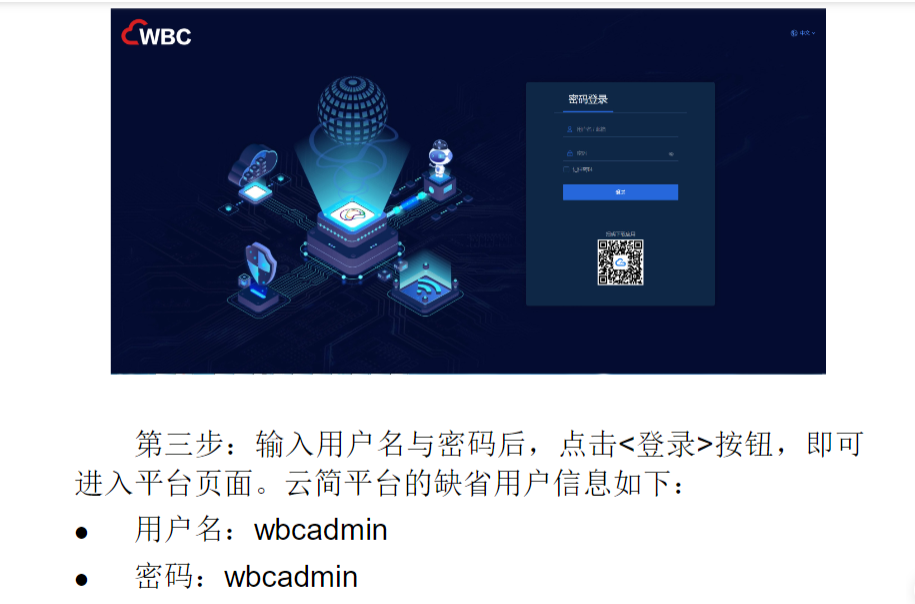 只看到了admin admin.Default.0506这个账号密码,这个只能拿来登陆WBC监控平台,进云简的话又需要一个账号密码,用admin这个就登不上去了