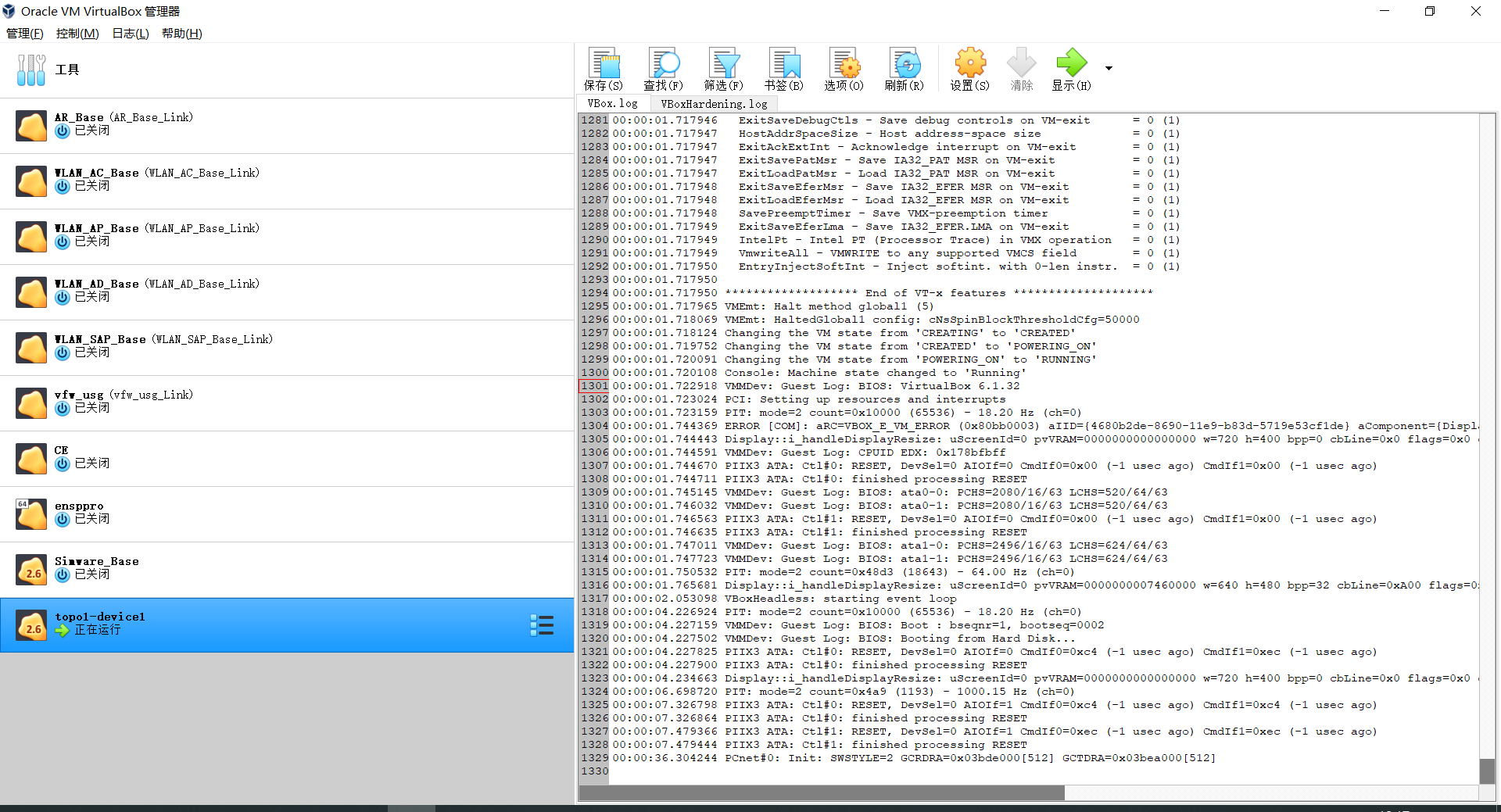 目前还是没有起来,打开virtual box有一个名topol-device1的虚拟机正在运行
