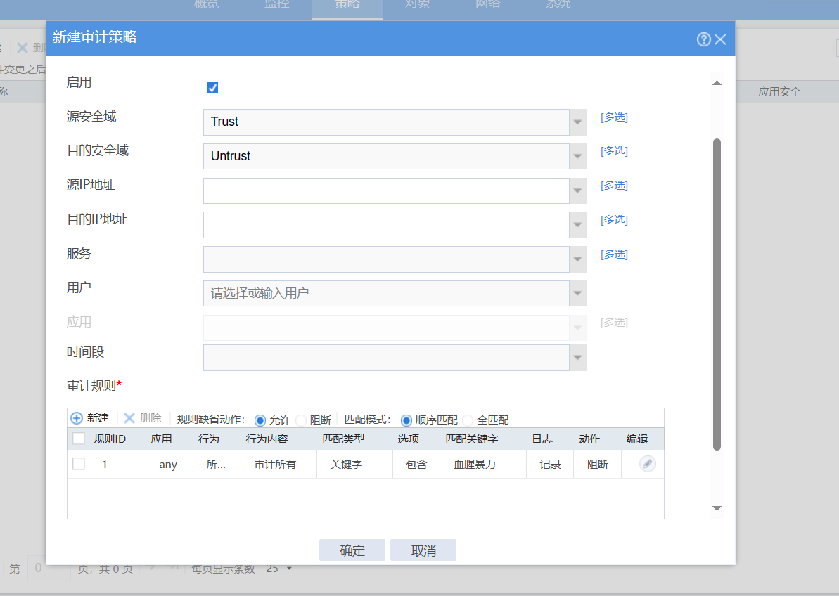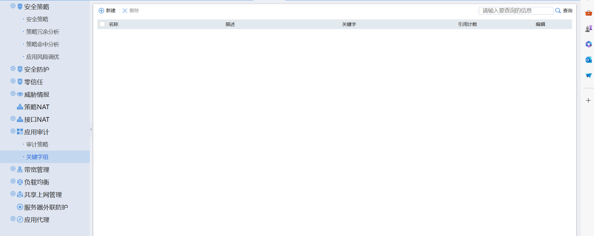 防火墙是买了ACG的授权,我在这里添加了关键词之后,在审计策略里面添加规则为审计的策略,策略类型为审计 。动作为阻断,但是最终不生效
