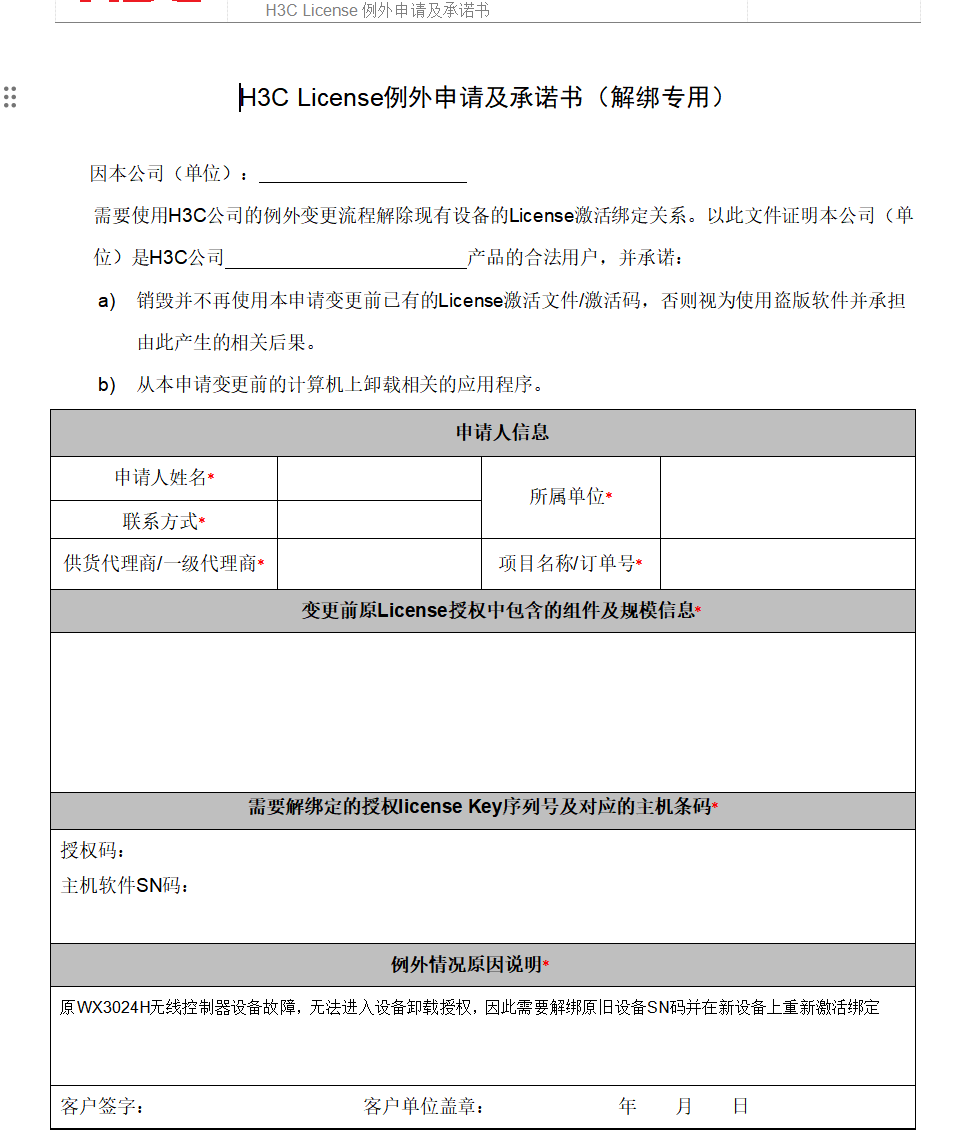 需要填写解绑申请书,然后客户盖章,扫描后发邮件给service@h3c.com进行解绑申请