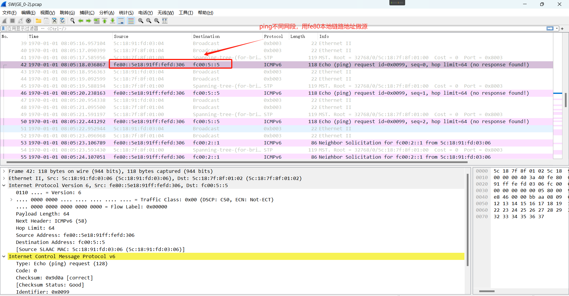 然后你可以把PC换成交换机,交换机配置IPv6地址和路由,你就会发现没问题了,因为不知道现在这个版本PC能不能指定使用接口的fc这个地址去ping