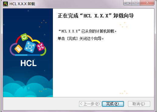 卸载进度完成后弹出如图2-16所示的卸载完成提示界面,点击“完成”按钮退出HCL卸载程序。