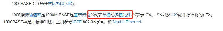 1000指传输速率是1000M,BASE是基带传输,X代表单模多模光纤.-X表示-CX、-SX以及-LX或(非标准化的)-ZX。1000BASE-X是非标准叫法,正规参考IEEE 802.3z标准。和Gigabit Ethernet.